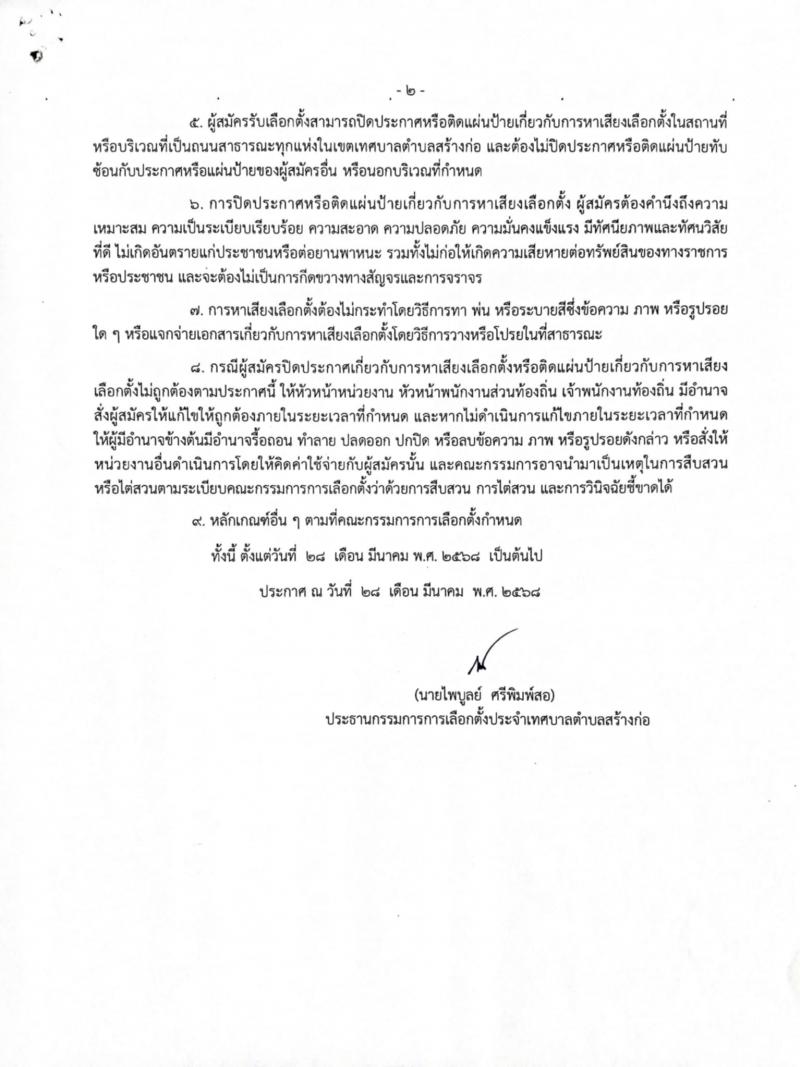 ประกาศคณะกรรมการการเลือกต้ังประจำเทศบาลตำบลสร้างก่อ เรื่องการกำหนดหลักเกณฑ์ วิธีการปิดประกาศและติดแผ่นป้ายเกี่ยวกับการหาเสียงเลือกตั้ง ในการเลือกตั้งสมาชิกสภาเทศบาลและนายกเทศมนตรี
